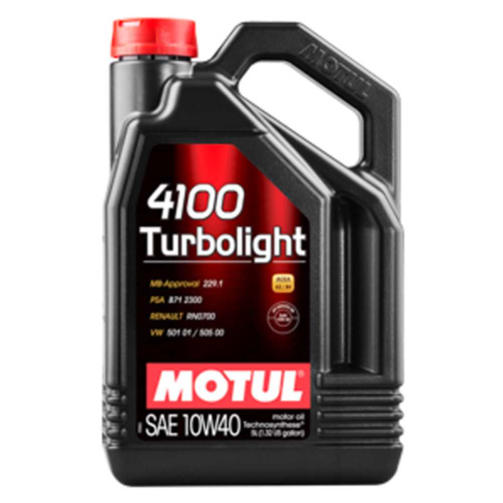 Motul 4100 Turboligth 10W40, Lubricante SAE 10W40 para vehículos de gran cilindrada, mezcla sintética + éster, bidón de 5 litros.